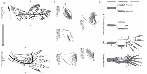 从四足动物肢体发育的胚胎学研究中得知的从鳍到肢体的系统发育转变,最近得到了与肢体生长和模式形成有关的Hox基因分析的支持。胚胎学研究表明,大多数鱼类的主要直的后肢轴线位于四足动物肢体中,向前弯曲以形成远端肢体的基础,使得手指从这个拱形轴线的后缘出现(图9.8c)。鱼类和小鼠中的Hox基因表达域证实,主轴向前拱形,手指从其后缘出现。已知控制四足动物肢体上手指形成的其他Hox基因也控制原始辐鳍鱼类鳍骨架的形成。因此,趾骨不是四足动物的新形态,而是代表了基础辐鳍鱼类中存在的一种古老的潜在遗传机制被带入早期四足动物,以促成趾骨的出现和分化。