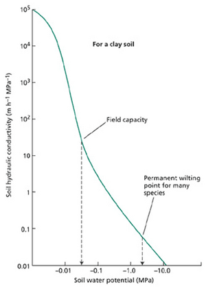 土壤导水率是土壤水势的函数。导水率衡量水分在土壤中移动的难易程度。随着含水量(以及因此的水势)降低,导水率急剧下降(网络图6.2.A;注意其为对数坐标)。