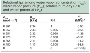 网络表6.4.A显示了根据网络公式6.4.2计算出的、作为水势函数的RH值。该表表明,当水势处于生理范围内时,活体叶片的气室必须具有较高的RH,其值接近1(100%)。此外,外部空气(例如RH为0.5,即50%)的水势非常低。