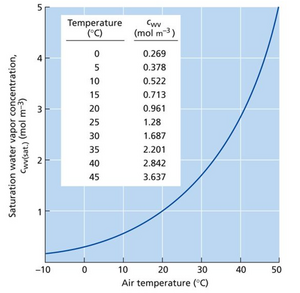 其中 R 是气体常数,T 是温度(单位为开尔文度),Vw 是液态水的偏摩尔体积,RH 是空气的相对湿度。相对湿度是水蒸气浓度表示为饱和水蒸气浓度 cwv(sat) 的分数: