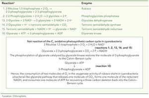 蓝细菌基因组编码植物C₂氧化光合碳循环的所有酶。光呼吸在第一批O₂生产者中的存在,表明这是一种与产氧光合作用密切相关的古老机制,是应对细胞内O₂的一种适应。尽管所有"类植物"光呼吸酶都存在,但现存的蓝细菌使用来自变形菌祖先的酶来回收在C₂氧化光合碳循环中损失的碳(网络图10.7.A和网络表10.7.A,反应1和2)。