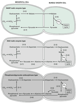 这些变体以催化各自脱羧反应的酶命名:叶绿体中发现的 NADP 依赖性苹果酸酶(NADP-ME);线粒体中的 NAD 依赖性苹果酸酶(NAD-ME);以及位于细胞质基质中的磷酸烯醇式丙酮酸羧激酶(PEP-CK)。文中讨论了NADP-ME类型(如甘蔗或玉米)的碳途径。