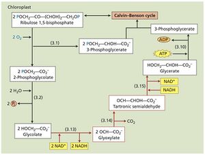 多项研究表明,与卡尔文循环一样,光呼吸的酶在体外催化所有拟议反应的速度高于体内光呼吸速率。此外,参与酶定位于叶绿体(Rubisco、磷酸乙醇酸磷酸酶、甘油酸激酶)、过氧化物酶体(乙醇酸氧化酶、过氧化氢酶、羟基丙酮酸还原酶以及两种氨基转移酶)和线粒体(甘氨酸脱羧酶和丝氨酸羟甲基转移酶)(见教材图10.8,B部分)(Hatch和Osmond,1976年;Tolbert,1981年;Bauwe等人,2010年)。