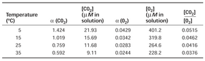 根据这些数值以及 α 的数值,可以通过上面给出的方程计算出 CO2 和 O2 的相应溶液浓度。下表(网络表 10.8.A)给出了这些浓度在不同温度下的数值。