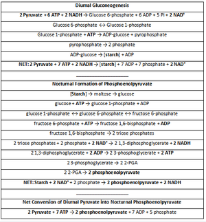 CAM 循环。 在夜间固定两个 CO2 分子还原草酰乙酸的过程中消耗了两个 NADH 分子,但在昼间释放两个 CO2 分子以运行卡尔文-本森循环的过程中又产生了两个 NADH 分子。也就是说,夜间 PEPCase 利用的两个还原型吡啶核苷酸分子,与昼间苹果酸酶产生的相似数量相匹配。