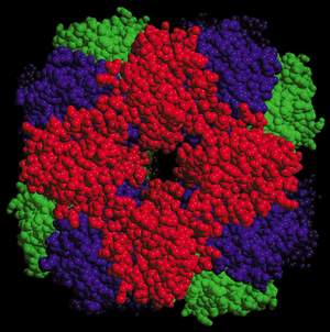编码Rubisco小亚基(rbcS)和大亚基(rbcL)的基因对于自养细胞的功能至关重要。与原核生物不同,原核生物中基因表达和蛋白质生物合成发生在同一细胞区室(细胞质)中,而大多数真核生物的Rubisco的组装则依赖于可能需要多个细胞区室参与的多种生化过程的协调作用。在植物(metaphyte)和绿藻(chlorophyte)的细胞核中,光介导的对rbcS表达的调控在细胞质核糖体上产生一个前体多肽。穿过叶绿体被膜的转运会移除N端叶绿体靶向肽,并在叶绿体基质中释放成熟形式。另一方面,植物和绿藻的叶绿体基因组编码rbcL,因此大亚基的生物合成完全发生在叶绿体核糖体上。Rubisco从其组成亚基的组装发生在叶绿体内。