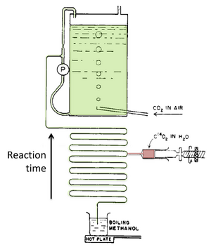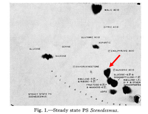 通过这种方式,3-磷酸甘油酸和各种磷酸糖被鉴定为碳固定的中间产物。通过让细胞暴露于¹⁴CO₂的时间逐渐缩短,卡尔文的研究小组能够确定3-磷酸甘油酸是第一个稳定的中间产物。因此,其他标记的磷酸糖必然源自3-磷酸甘油酸的后续还原(Bassham,1954)。