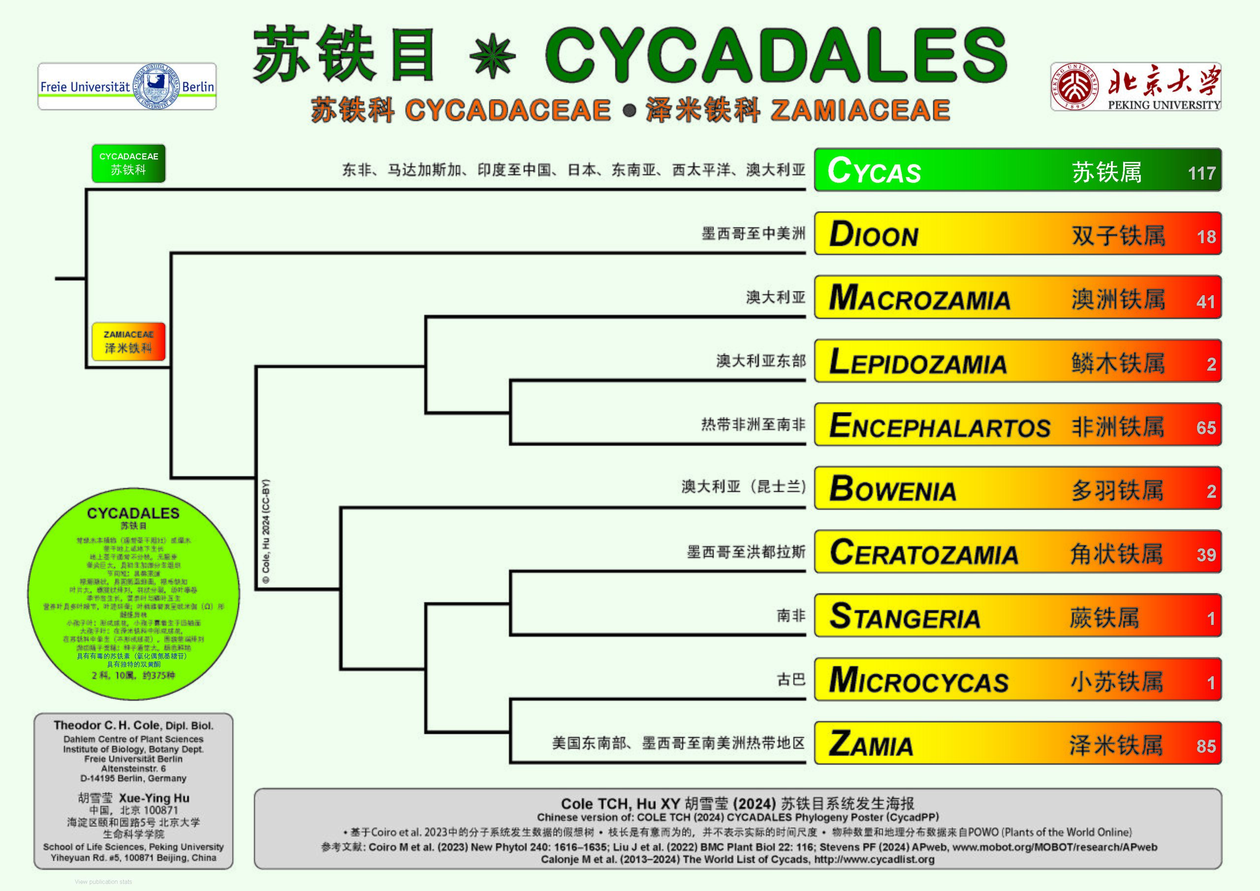 Cole, Theodor & Hu, Xue-Ying. (2024). 苏铁目系统发生海报 CYCADALES (CycadPP, Chinese).