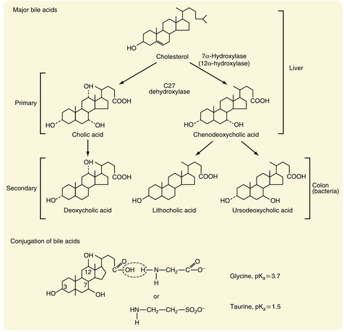 • 图32.5  胆汁中主要初级和次级胆汁酸的结构。初级胆汁酸在肝脏合成。次级胆汁酸由肠道细菌作用于初级胆汁酸生成。图底部显示胆酸与甘氨酸或牛磺酸的结合过程。