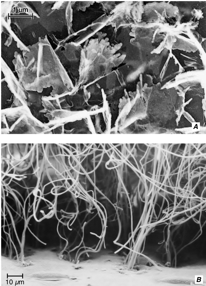 显示表皮蜡的表皮表面视图。A,Pisum叶片上表面的板状蜡突起。B,高粱(Sorghum bicolor)叶鞘下表面的蜡丝。(A,来自Juniper, 1959。$\copyright$ 1959,经Elsevier许可;B,来自Jenks et al., 1994。$\copyright$ 1994,芝加哥大学版权所有。)