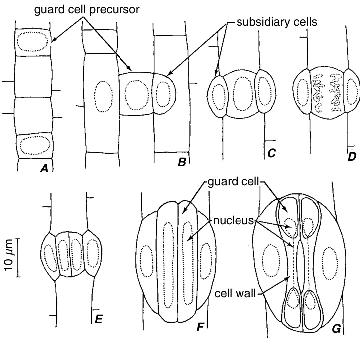 燕麦(Avena sativa)节间气孔复合体的发育。副卫细胞为周生(perigenous)。A,两个短细胞是保卫细胞前体。B,左侧,长细胞的核处于分裂形成副卫细胞的位置;右侧,副卫细胞已经形成。C,有丝分裂前的保卫细胞前体。D,有丝分裂后期的保卫细胞前体。E,由两个保卫细胞和两个副卫细胞组成的气孔复合体仍未成熟。F,气孔复合体的细胞已经伸长。G,气孔复合体成熟。(引自 Esau, 1977;图片来自 Kaufman 等, 1970a。)