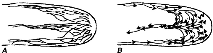 生长中的Nicotiana tabacum根毛尖端的示意图。A,肌动蛋白丝(actin filaments)的分布。B,反向喷泉流(reverse fountain streaming)。(来自Hepler等,2001。经许可转载自《细胞与发育生物学年度评论》,第17卷。$\copyright$ 2001 by Annual Reviews. www.annualreviews.org)