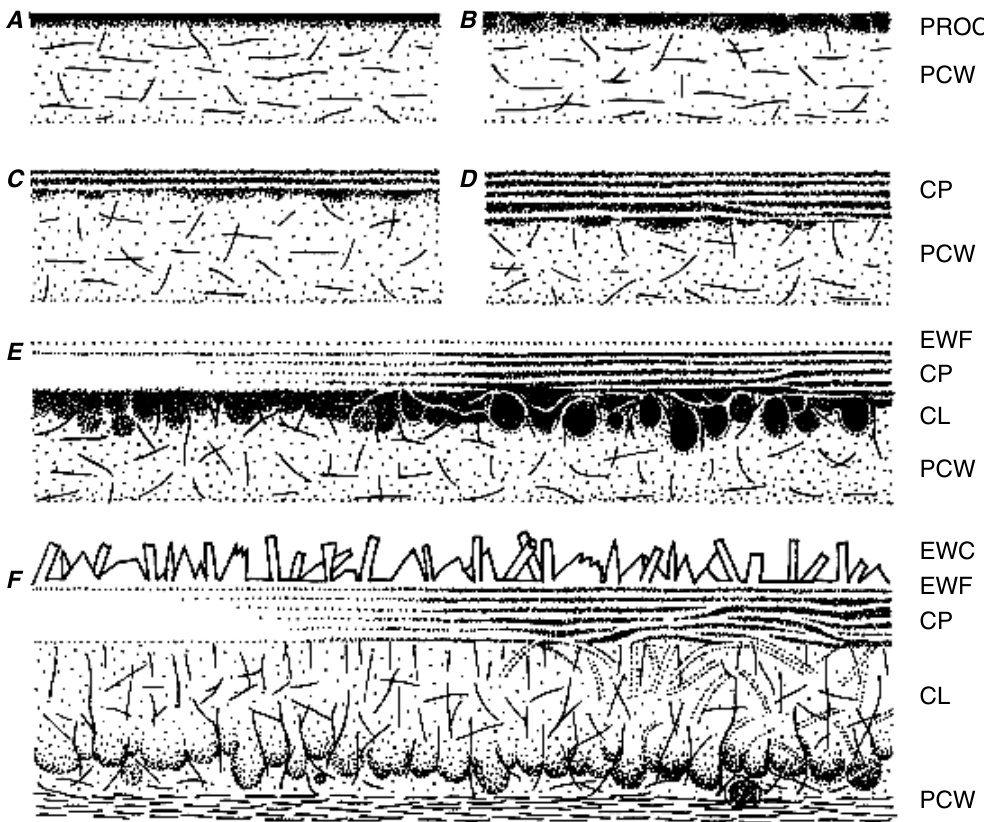 植物角质层的真正角质层(CP)的发育以及初生细胞壁(PCW)内角质层(CL)发育的早期阶段。A-D,原角质层向片层真正角质层的转化。球形脂质(globular lipids)可能参与片层真正角质层的进一步构建,如E所示。E,涂有电子透明壳(electron-lucent shells)的球形脂质构建真正角质层/角质层过渡区。片层可能变得不那么规则。真正角质层表面显然存在一层无定形的表皮蜡膜(epicuticular wax film,EWF)。F,初生细胞壁(PCW)并入角质层。主要是径向的网状结构(reticulations)延伸到真正角质层。表皮蜡晶体(epicuticular wax crystals,EWC)在细胞扩张停止之前开始形成。(来自Jeffree,1996,图2.12a-f。$\copyright$ Taylor and Francis。)
