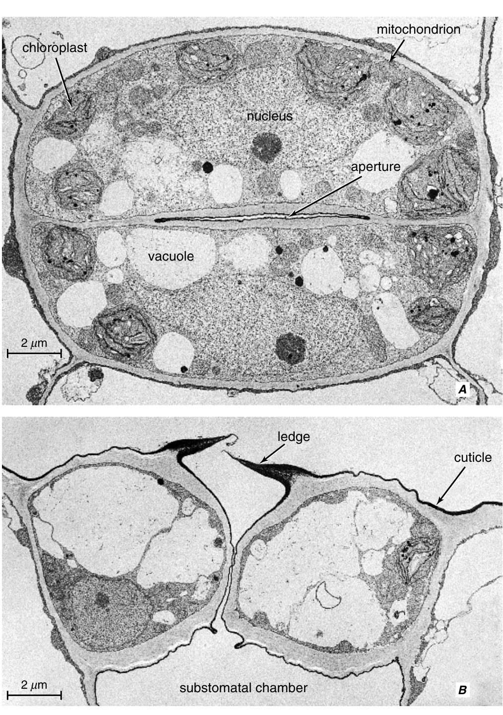 双子叶植物(Eudicots)的保卫细胞在表面视图中通常呈新月形,末端钝圆(肾形)(图9.10A和9.11D),并且在外部或内外两侧具有壁架。在切面视图中,这些壁架看起来像角。如果存在两个壁架,外壁架界定前腔,内壁架界定后腔。具有两个壁架的气孔实际上有三个开口,由壁架形成的外开口和内开口,以及由相对的保卫细胞壁在两者之间形成的中央开口。内开口很少完全关闭,根据气孔形成的阶段,外开口或中央开口可能是最窄的(Saxe, 1979)。保卫细胞被角质层覆盖。如前所述,角质层延伸通过气孔开口并进入气孔下腔。显然,保卫细胞的角质层在化学组成上与普通表皮细胞不同,并且比后者更透水(Schönherr和Riederer, 1989)。每个保卫细胞都有一个显著的细胞核、许多线粒体和发育不良的叶绿体,其中淀粉通常在夜间积累,并在白天随着气孔开放的增加而减少。液泡系统(Vacuolar System)被不同程度地分割。在关闭和开放的气孔之间,液泡体积的差异很大,从关闭气孔中细胞体积的很小一部分到开放气孔中超过$90\%$。类似于双子叶植物的肾形保卫细胞也出现在一些单子叶植物(Monocots)和裸子植物(Gymnosperms)中。