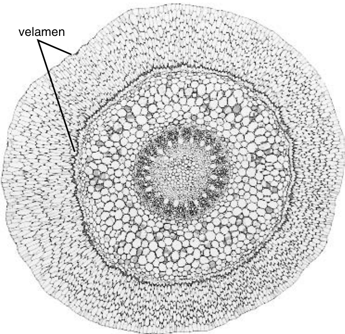 兰科植物根的横切面,显示复表皮或根被。$(\times25.)$