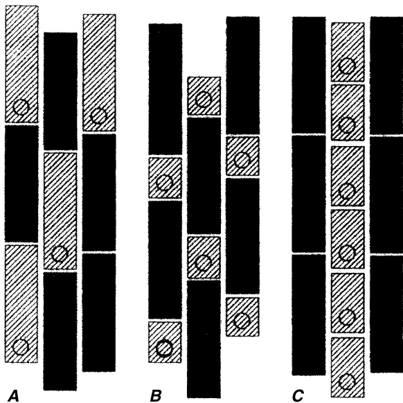 被子植物根表皮的三种主要模式类型。斜线细胞是根毛细胞,黑色细胞是无毛细胞。圆圈表示根毛基部的位置。A,类型1。任何原表皮细胞都可以形成根毛。B,类型2。根毛起源于不对称分裂的较小产物(毛状体母细胞)。C,类型3。有离散的垂直列,完全由较短的毛细胞和较长的无毛细胞组成。(来自Dolan, 1996,经牛津大学出版社许可。)