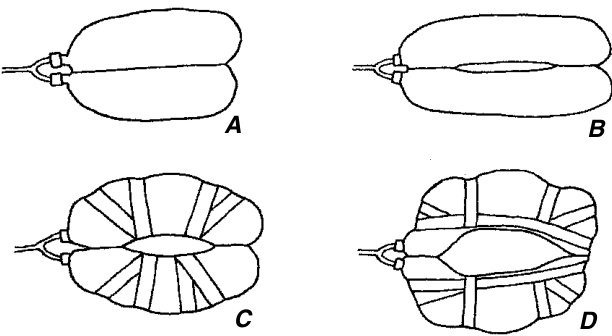 研究保卫细胞壁中微纤维径向排列对气孔打开影响的模型。A,两个乳胶圆柱体在末端连接并部分充气。B,相同模型在更高压力下。可见一条窄缝。C,在充气的圆柱体上模拟径向微纤化的胶带带。缝比B中宽。D,径向微纤化延伸到圆柱体的末端,并且一些胶带沿着“腹壁”存在。充气导致形成比C中更宽的缝。(来自Esau, 1977;绘图改编自Aylor, Parlange, 和 Krikorian, 1973的照片。)
