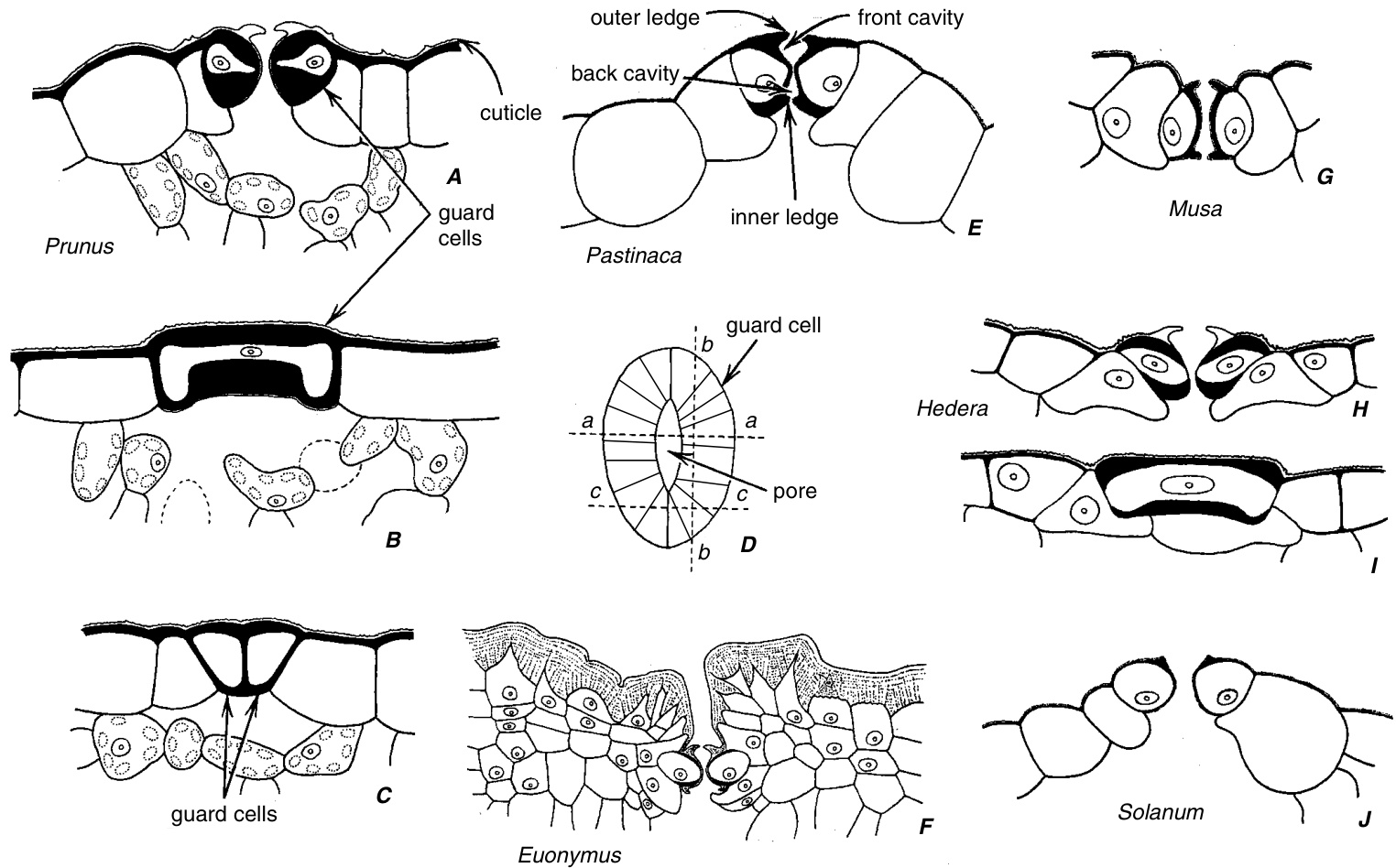 叶片下表皮的气孔(Stomata)。A–C,沿$\mathbf{D}$中虚线aa、bb和cc指示的平面切开的桃叶中的气孔和一些相关细胞。E–H、J,沿平面aa切割的各种叶片的气孔。I,沿平面bb切割的常春藤的一个保卫细胞(Guard Cell)。气孔在A、E、J中凸起。在H中略微凸起,在G中略微凹陷,在F中深度凹陷。各种保卫细胞中的角状突起是壁架(Ledges)的切面视图。有些气孔有两个壁架(E、F、G);其他只有一个(A、H、J)。壁架在A、F、H中是角质层(Cuticular)的。卫矛叶$(\mathbf{F})$具有厚的角质层;表皮细胞部分被角质(Cutin)堵塞。(A–D、F–J,$\times712$;E,$\times285$。)