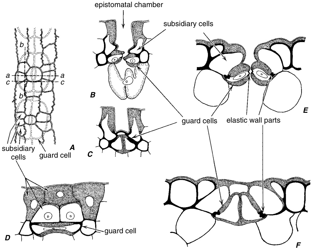 这一特征似乎与保卫细胞内膨压变化引起的形状和体积变化(以及随之而来的气孔孔径大小的变化)有关。在肾形保卫细胞中,远离气孔的壁(背壁)通常比靠近气孔的壁(腹壁)更薄,因此更具弹性。肾形保卫细胞在其末端相互连接处受到限制;此外,这些共同的保卫细胞壁在膨压变化期间几乎保持长度不变。因此,膨压的增加导致薄的背壁向远离气孔的方向凸出,而面向气孔的腹壁则变直或凹陷。整个细胞似乎向远离气孔的方向弯曲,气孔孔径增大。在膨压降低时,发生相反的变化。