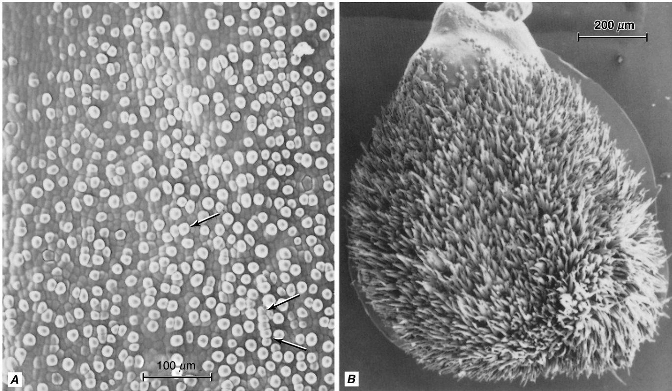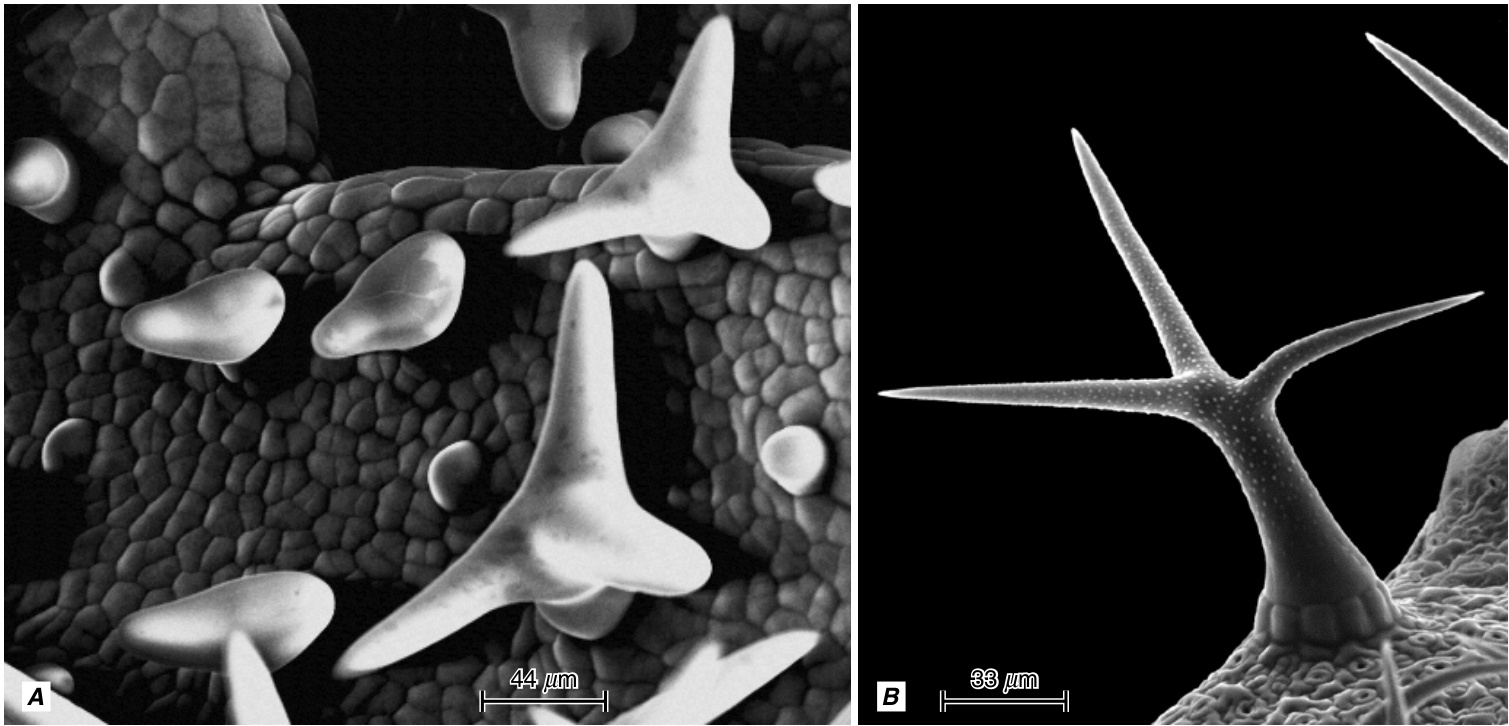 拟南芥叶片近轴面的扫描电子显微镜图像,显示(A)单个叶片上毛状体形态发生的各个阶段,以及$\mathbf{(B)}$具有乳头状突起的成熟毛状体。(由Jaideep Mathur提供。)