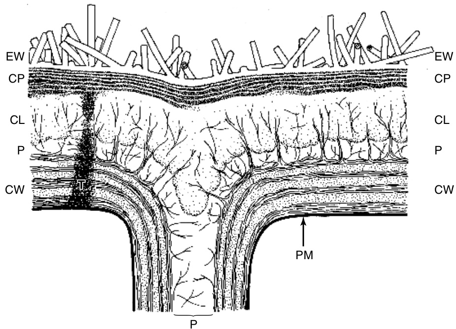 植物角质层的总体结构。细节:CL,角质层或网状区域,由纤维素微纤维穿过;CP,角质层本身,显示层状结构;CW,细胞壁;EW,表皮蜡;P,果胶层和中胶层;PM,质膜;T,teichode。(来自Jeffree, 1986。经剑桥大学出版社许可转载。)