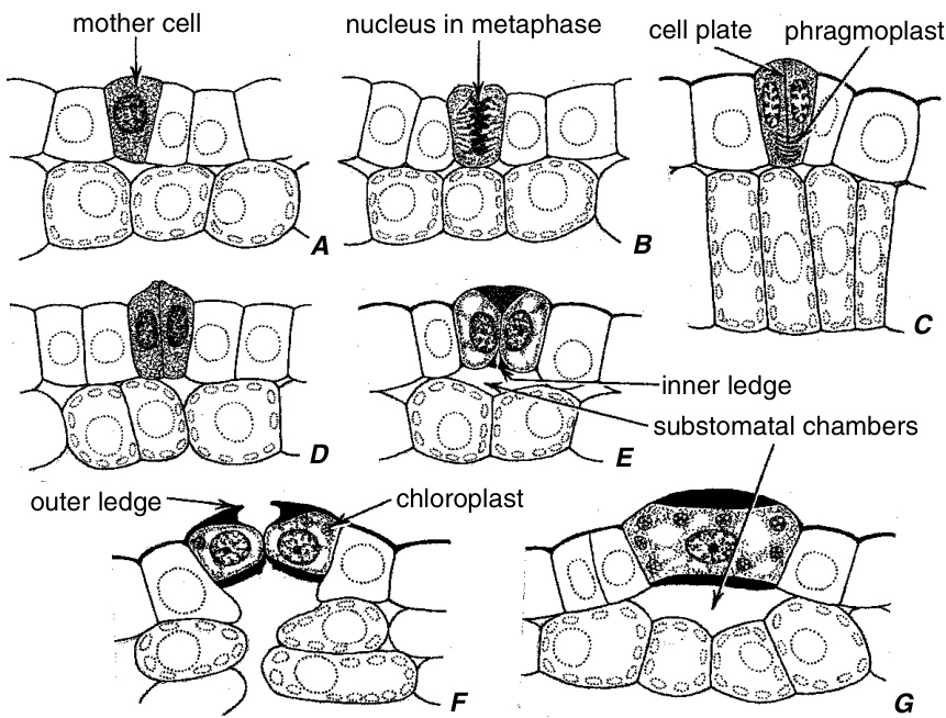 Nicotiana(烟草)叶片气孔发育的切面观。C,来自近轴表皮,带有一些栅栏细胞(palisade cells);其他来自远轴表皮。A–C,保卫细胞母细胞在分裂为两个保卫细胞之前和期间。D,具有薄壁的年轻保卫细胞。E,保卫细胞横向延伸并开始增厚其细胞壁。内部突起(inner ledge)和气孔下腔(substomatal chamber)已形成。F,成熟的保卫细胞具有上下突起和不均匀增厚的细胞壁。G,一个成熟的保卫细胞沿其长轴平行切割,并与叶片表面垂直。(所有,$\times490$。)