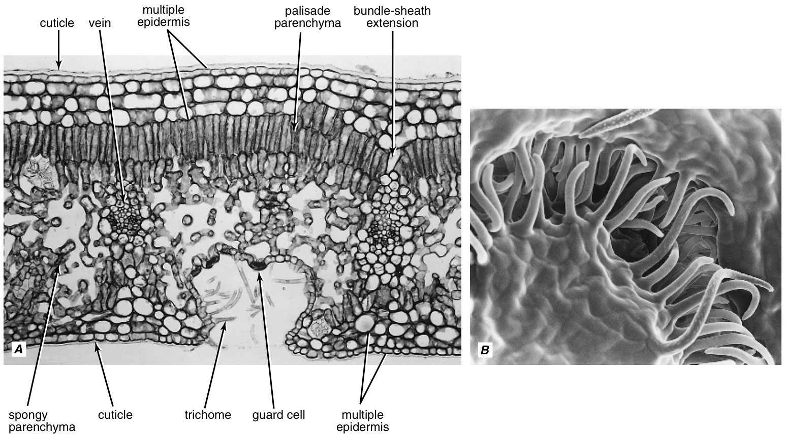 夹竹桃(Nerium oleander)叶片。A,横切面显示叶片下侧的气孔窝(stomatal crypt)。在夹竹桃中,气孔(stomata)和表皮毛(trichomes)仅限于气孔窝内。夹竹桃叶片具有复表皮(multiple epidermis)。B,气孔窝的扫描电子显微镜图像,显示气孔窝内排列着大量表皮毛。(A,$\times177$;B,$\times725$。)