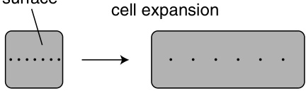 在单子叶植物Tradescantia的叶片中,表皮细胞的活动可以分为四个主要区域或区域:增殖分裂区(基部分生组织)、无分裂的气孔模式形成区、有分裂的气孔发育区以及仅发生细胞扩展的区域(Chin et al., 1995)。当新细胞从基部分生组织移位时,它们在细胞周期中的位置显然决定了它们在到达模式形成区时是否会成为气孔细胞或表皮细胞(Chin et al., 1995; Croxdale, 1998)。Tradescantia中的气孔模式也受到晚期发育事件的影响,这些事件可能会阻止多达$10\%$的气孔初始细胞(保卫母细胞)的发育(Boetsch et al., 1995)。被阻止的初始细胞比气孔之间的平均距离更接近其最近的邻近初始细胞。这里可能涉及侧向抑制。被阻止的初始细胞会转换发育途径并成为普通表皮细胞。