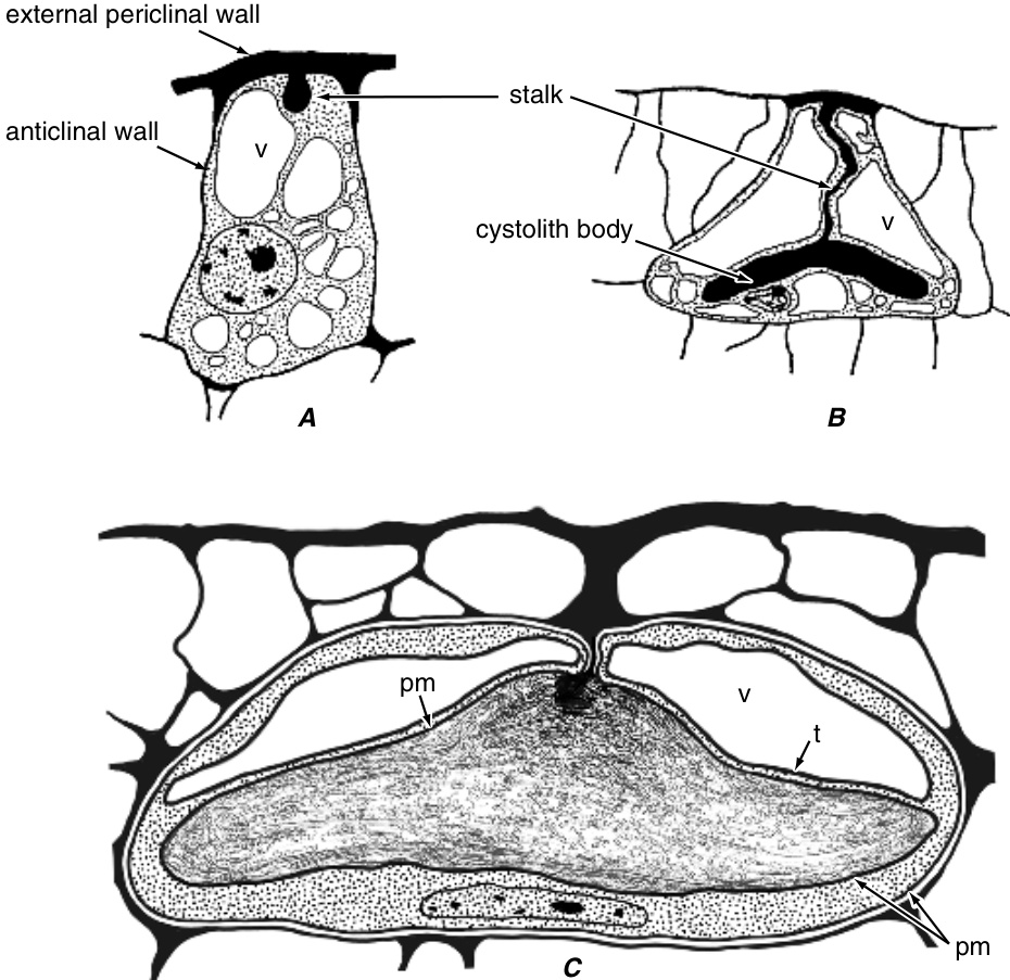 Watt 等人, 1987; Galatis 等人, 1989)。$P.$ cadierei 中的石细胞(lithocyst)是由原表皮细胞(protodermal cell)的不对称分裂起始的。较小的子细胞可能直接分化成石细胞,或者它可能经历另一次分裂产生一个石细胞。无论哪种情况,初始的石细胞都会变得极化,因为细胞核和大多数细胞器都靠近内部平周壁(internal periclinal wall),而外部平周壁(external periclinal wall)开始增厚。当分化中的石细胞的外部平周壁变得大约为普通原表皮细胞的两倍厚时,石细胞柄(stalk of the cystolith)作为一个栓状物开始形成,它向下生长,推动质膜向前。在柄形成过程中,石细胞开始迅速液泡化(vacuolate),液泡系统占据了整个细胞空间,除了柄和石细胞体(cystolith body)正在发育的区域。在与周围分裂细胞协调生长的同时,石细胞大大伸长,似乎滑到表皮(epidermis)下方。因此,曾经小而矩形的细胞显著增大并变成纺锤形。石细胞体的发育与石细胞的发育相协调,两者同时伸长并增加直径。随着石细胞分化的进行,微管(microtubule)的数量和组织不断变化,表明微管在石细胞形态发生(morphogenesis)中起重要作用(Galatis 等人, 1989)。当完全形成时,纺锤形石细胞体的长度可达 $200\upmu\mathrm{m}$,直径可达 $30\upmu\mathrm{m}$,其中部区域通过柄附着在外部平周壁上。成熟时,石细胞体富含碳酸钙。一些石细胞体还含有二氧化硅,并被硅质材料鞘(sheath of siliceous material)覆盖(Watt 等人, 1987)。