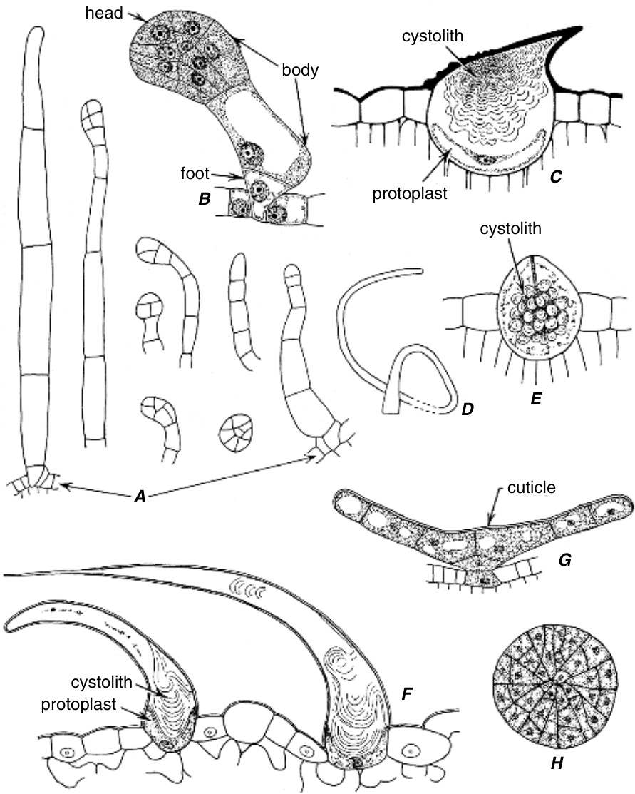 毛状体。A,Nicotiana(烟草)的一组普通毛状体和腺毛状体(具多细胞头)。B,烟草腺毛状体的放大图,显示腺头内容物的特征密度。C,Humulus的钩状毛状体,具钟乳体(cystolith)。D,长卷曲单细胞毛状体,E,Boehmeria的短刚毛,具钟乳体。F,Cannabis的钩状毛状体,具钟乳体。G,H,Humulus的腺盾状毛状体,分别显示横切面$(\mathbf G)$和表面$\mathbf{\eta}(\mathbf{H})$视图。(H来自比$\mathbf{G}$年轻的毛状体。)(A,F,$\times100$;B,D,E,$\times310$;C-G,$\times245$;H,$\times490.\$)