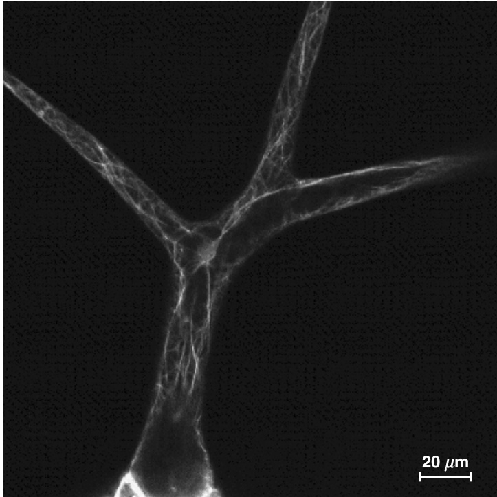 Arabidopsis毛状体中的丝状肌动蛋白细胞骨架。使用与小鼠Talin基因的肌动蛋白结合域融合的GFP在活体毛状体中可视化F-肌动蛋白。(由Jaideep Mathur提供。)