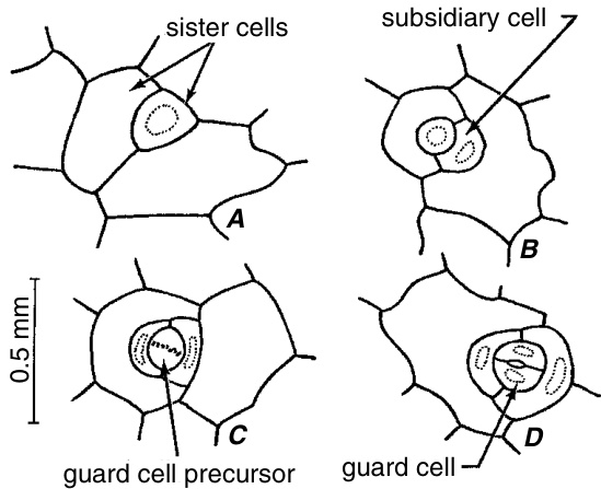 在具有中生副卫细胞(mesogenous subsidiary cells)的气孔发育过程中(图9.20),气孔复合体(stomatal complex)的前体(即分生细胞,meristemoid)通过原表皮细胞(protodermal cell)的不对称分裂形成,随后两次不对称分裂将前体分割为保卫细胞母细胞(guard mother cell)和两个副卫细胞(subsidiary cells)。再进行一次均等分裂,最终形成两个保卫细胞(guard cells)。