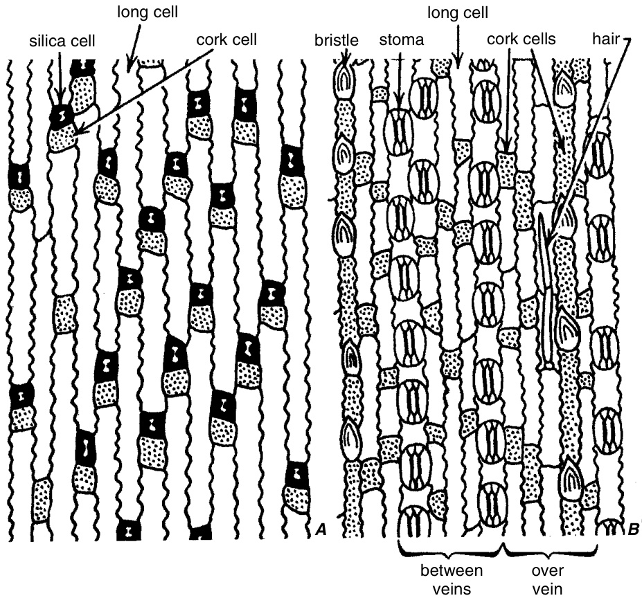 硅质$\mathrm{(SiO}_{2}{\cdot}n\mathrm{H}_{2}\mathrm{O)}$大量沉积在禾本科植物的茎叶系统中,硅质细胞之所以得名,是因为当它们完全发育时,它们的腔体充满了各向同性的硅质体。木栓细胞具有栓质化的壁,通常含有固体有机物质。除了短细胞的频率和分布外,硅质细胞中硅质体的形状或形式对于诊断和分类目的非常重要(Metcalfe, 1960; Ellis, 1979; Lanning and Eleuterius, 1989; Valdes-Reyna and Hatch,