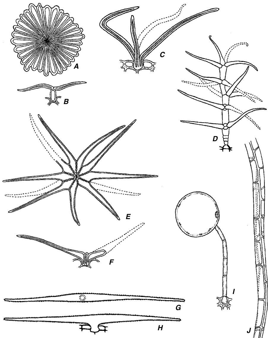 毛状体。A, B, Olea的盾状鳞片,表面$\mathbf{\eta}(\mathbf{A})$和侧面$\mathbf{(B)}$视图。C, Quercus的簇状星状毛。D, Platanus的树枝状毛。E, F, Sida的星状毛,表面$\mathbf{(E)}$和侧面$\mathbf{(F)}$视图。G, H, Lobularia的二臂T形单细胞毛,表面$(\mathbf G)$和侧面$\mathbf{\eta}(\mathbf{H})$视图。I, Chenopodium的囊状毛。J, Portulaca的多细胞蓬松毛的一部分。(A–C, I, $_{\times210}$ ; D–H, J, $\times105.$ )