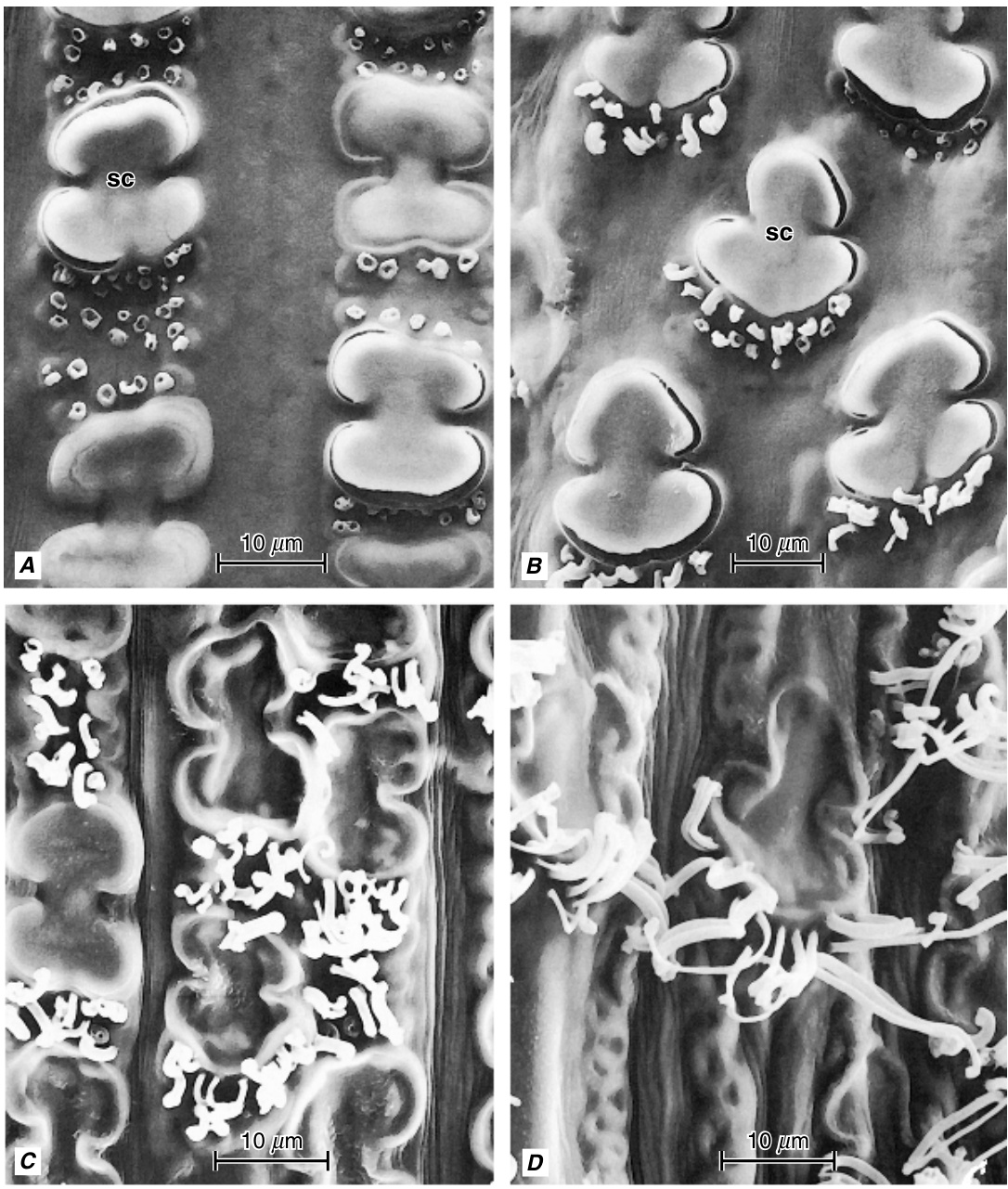 Sorghum bicolor叶鞘背面表皮蜡质丝状体的发育。A,蜡质丝状体从邻近硅细胞(sc)的软木细胞中伸出。最初,丝状体表现为圆形分泌物。B,随着进一步发育,分泌物表现为短圆柱体。C,D,随着继续发育,分泌物形成表皮蜡质丝状体的簇。(来自 Jenks 等,1994。$\copyright$ 1994 年芝加哥大学。版权所有。)