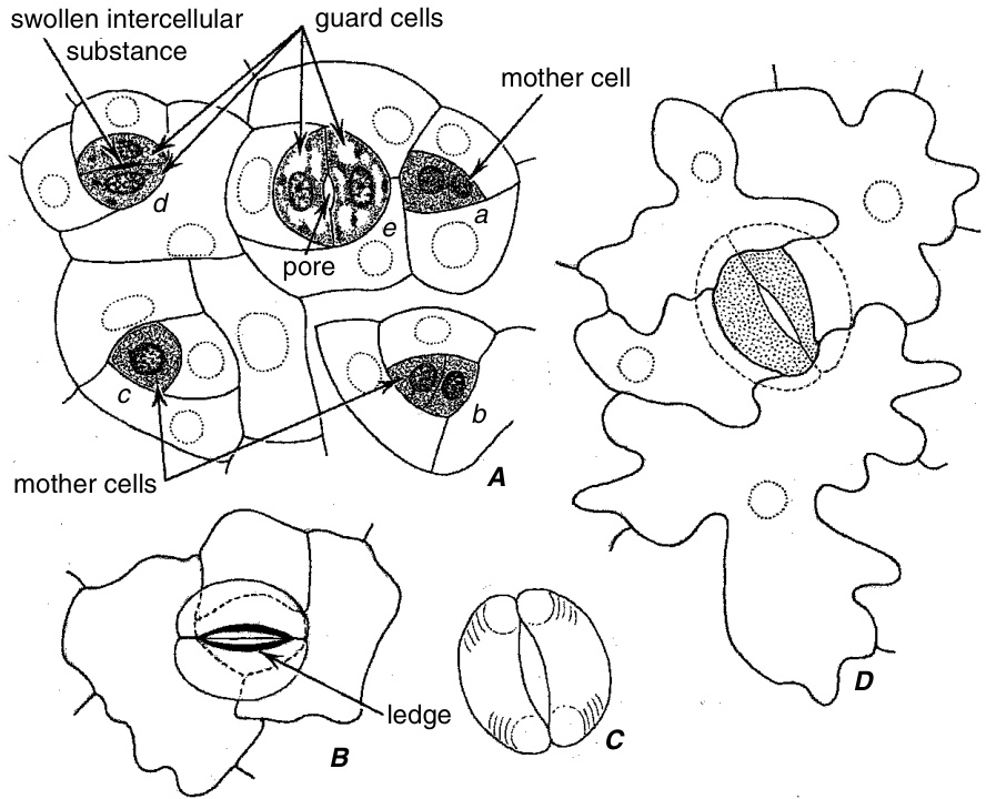 Nicotiana(烟草)气孔的表面观。A,发育阶段:a、b,分裂后不久形成保卫细胞母细胞;c,保卫细胞母细胞已增大;d,保卫细胞母细胞分裂为两个保卫细胞,仍然完全连接,但在未来气孔的位置上有肿胀的细胞间物质;e,年轻的保卫细胞之间形成气孔。B,从近轴表皮(adaxial epidermis)外侧观察到的成熟气孔。D,从远轴表皮(abaxial epidermis)内侧观察到的类似气孔。保卫细胞隆起,因此在B中看起来高于表皮细胞,在D中则低于表皮细胞。C,从表皮内侧观察到的保卫细胞。(A,$\times620$;B–D,$\times490$。)