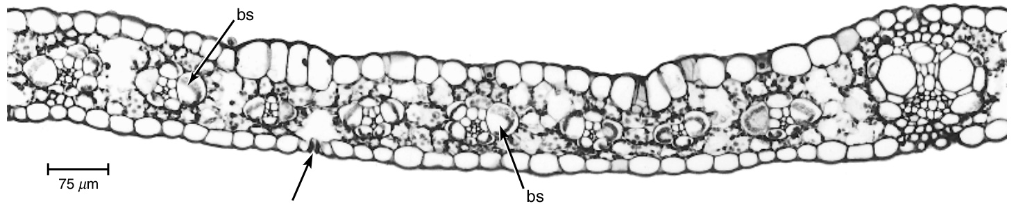 玉米(Zea mays)叶片的横切面显示叶片两侧均为单层表皮(epidermis)。此处可见一个气孔(stoma)(箭头所示)。不同大小的维管束(vascular bundles)由显著的维管束鞘(bundle sheaths, bs)与叶肉(mesophyll)分隔开。(引自Russell和Evert,1985,图1。$\copyright$ 1985,Springer-Verlag。)