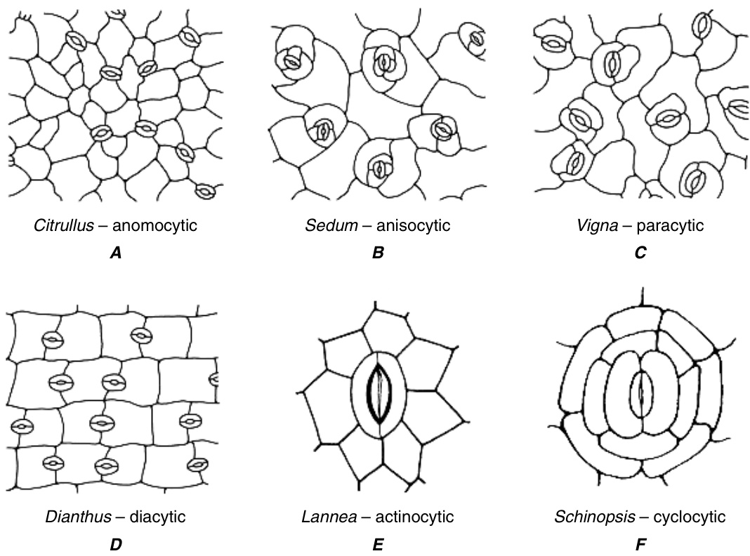 表皮表面视图,展示了气孔构型的主要类型。(A-D,来自Esau, 1977;E,图10.3b和F,图10.3h,重绘自Wilkinson, 1979, Anatomy of the Dicotyledons, 2nd ed., vol. I, C. R. Metcalfe和L. Chalk编辑,经牛津大学出版社许可。)