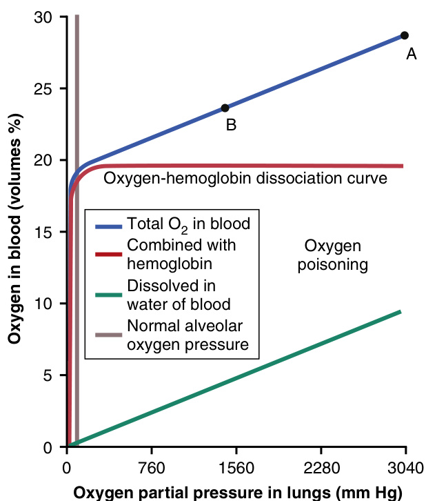 极高\scriptstyleP o2对血液氧运输的影响。当血液中的Po2上升到100mmHg以上时,溶解在血液水中的O2量显著增加。这种效应如图45-2所示,该图描绘了与第41章中相同的O2-血红蛋白解离曲线,但肺泡Po2扩展到超过3000~mm~Hg。图中最低的曲线还描绘了在每个Po2水平下溶解在血液液体中的O2体积。请注意,在肺泡Po2的正常范围内(<120mmHg),血液中的总O2几乎没有由溶解的O2贡献,但随着O2压力上升到数千mmHg,除了与血红蛋白结合的部分外,总O2的很大一部分溶解在血液的水中。