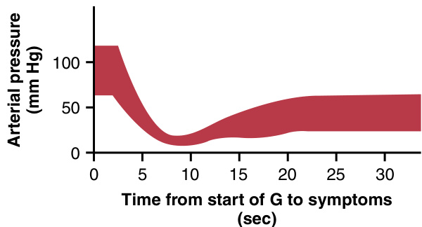 当飞行员受到正G时,血液被离心到身体的最下部。因此,如果离心加速度力是+5G,而人处于固定的站立位置,脚部静脉的压力就会大大增加(达到\approx450mmHg)。在坐姿时,压力接近300mmHg。此外,随着下半身血管压力的增加,这些血管被动扩张,使上半身的大部分血液转移到下半身的血管中。因为心脏只有在血液回流时才能泵血,所以以这种方式"淤积"在下半身的血液越多,心脏输出的血液就越少。