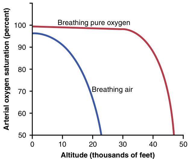 图44-1中的红色曲线显示了一个人在呼吸纯氧时,不同海拔高度下动脉血血红蛋白(hemoglobin)的氧饱和度(oxygen saturation)。请注意,饱和度保持在90%以上,直到飞行员上升到约39,000英尺;然后迅速下降到约47,000英尺时的50%。