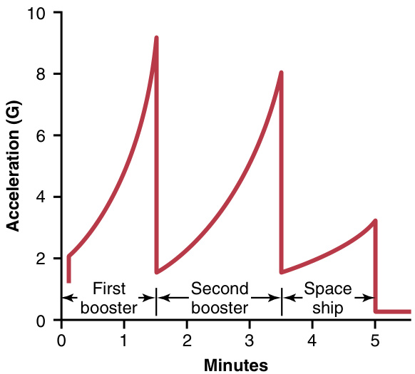 图44-4展示了一个三级航天器在起飞过程中加速度的近似曲线,表明第一级助推器导致的加速度高达9~G~,第二级助推器则高达8~G~。在站立姿势下,人体无法承受如此大的加速度,但在与加速度轴横向的半躺姿势下,尽管加速力可能持续几分钟,这种程度的加速度可以轻松承受。因此,可以理解为什么宇航员使用倾斜座椅。