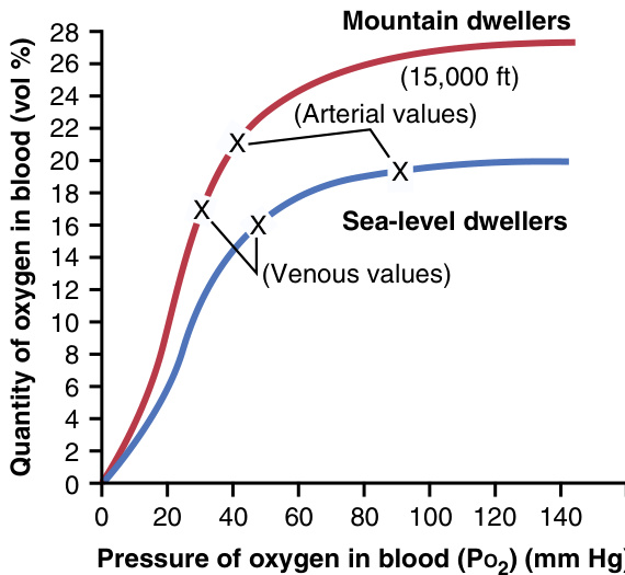 图44-2. 高海拔居民(红色曲线)和海平面居民(蓝色曲线)血液的氧-血红蛋白解离曲线 (Oxygen-hemoglobin dissociation curves),显示了在各自自然环境中记录的动脉和静脉P o2水平以及氧含量。(数据来源:Pan American Health Organization. Oxygen-dissociation curves for bloods of high-altitude and sea-level residents. Life at high altitudes. Washington, DC: Pan American Health Organization Scientific Publication No. 140, 1966.)