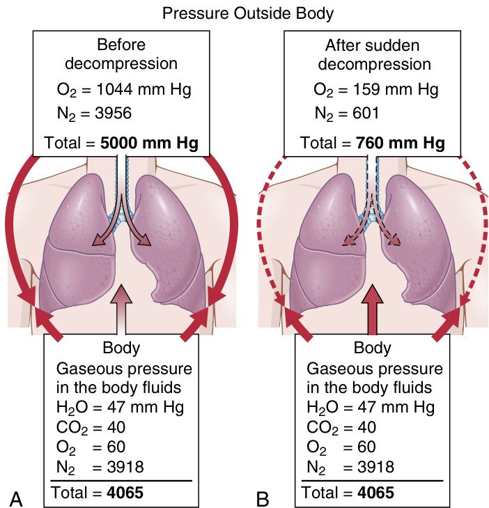 由于氮气不会被身体代谢,它会一直溶解在身体的所有组织中,直到肺部的氮压降低到某个较低水平,这时氮气可以通过相反的呼吸过程被移除。然而,这种移除通常需要数小时才能完成,并且是多种问题的根源,统称为减压病(decompression sickness)。